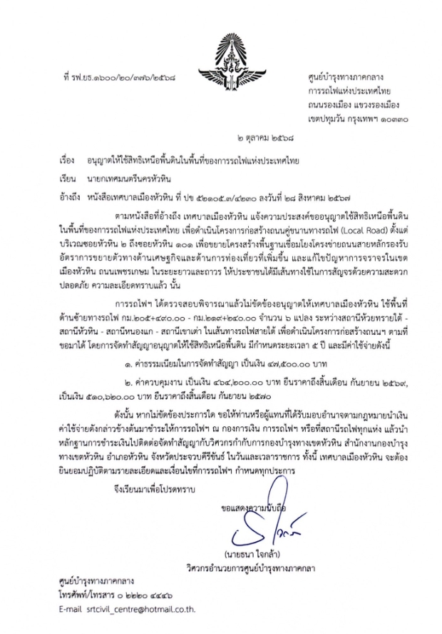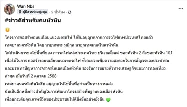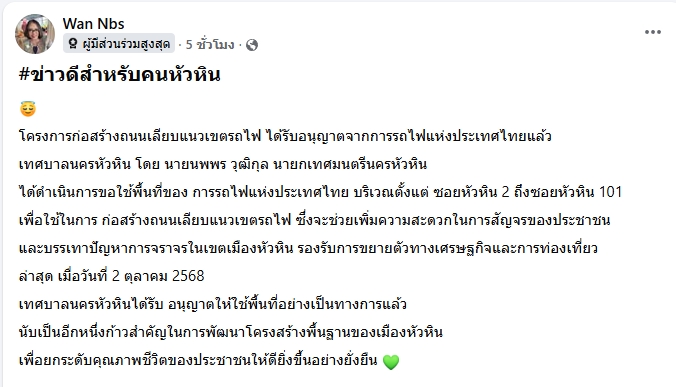 เทศบาลนครหัวหินได้รับอนุญาตจากการรถไฟแห่งประเทศไทย ให้ใช้พื้นที่ตั้งแต่ซอยหัวหิน 2 ถึงซอยหัวหิน 101 เพื่อก่อสร้างถนนเลียบแนวเขตรถไฟ โครงการนี้จะช่วยลดปัญหาการจราจรและส่งเสริมการพัฒนาเศรษฐกิจ–การท่องเที่ยวของหัวหิน ถือเป็นอีกก้าวสำคัญในการพัฒนาเมืองและยกระดับคุณภาพชีวิตประชาชน 💚